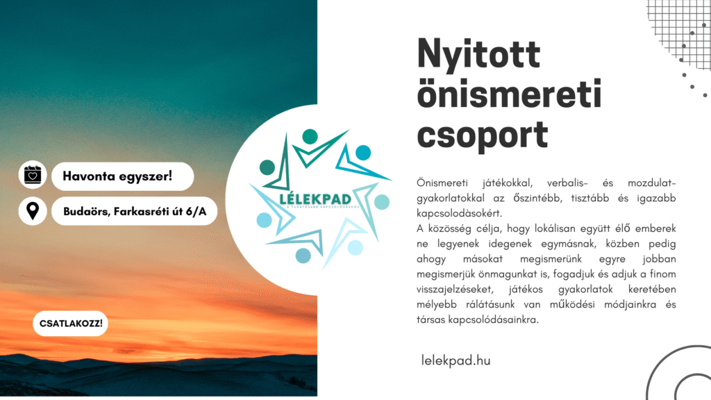 Egyre mélyülnek ezek a megosztások arról, ki miben van éppen élete területein. Aztán az első igazán nehéz tapasztalás megfogalmazása, meghívja a jelenlévőkben az erre ráépülő saját élményüket. így vált a „nem vagyok elég” és a „megfelelés másnak vagy magamnak” az elmúlt csoport ülésünk témájává. Gyönyörű élmény a folyamat vezetőjeként látni, hogy lesz a sok különbözőből ugyanannak az egynek a vetülete.